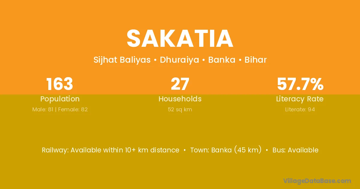Banka (45 km) is the nearest town to Sakatia village for major economic activities and is located approximately 45 km away.