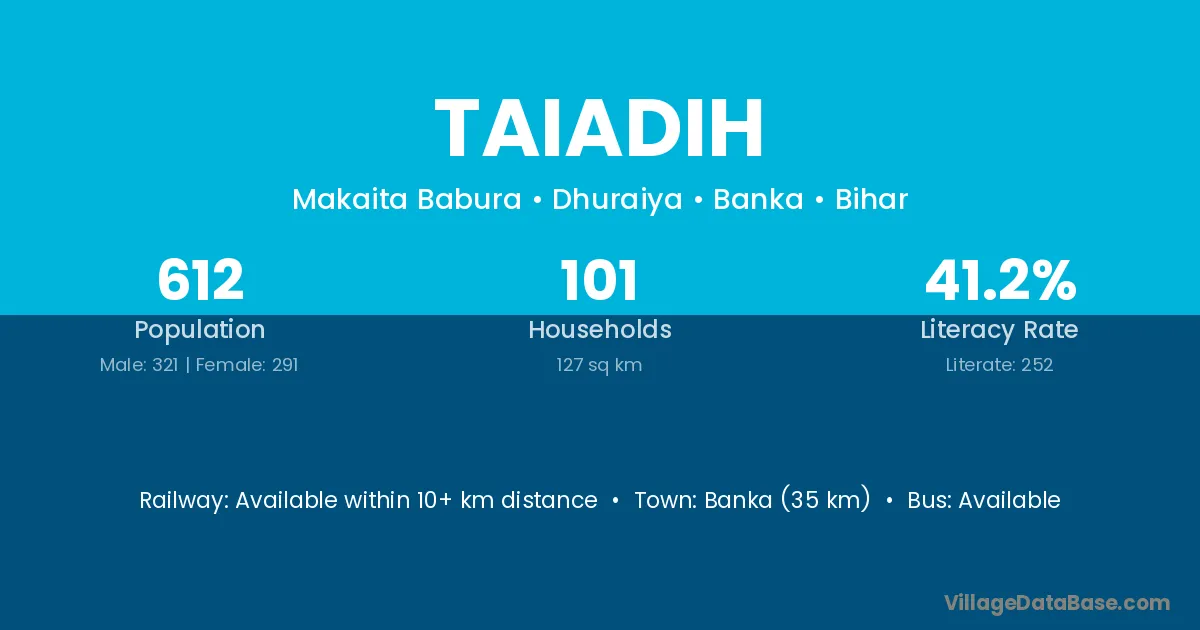 Banka (35 km) is the nearest town to Taiadih village for major economic activities and is located approximately 35 km away.