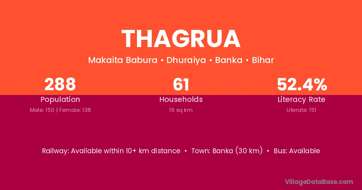 Banka (30 km) is the nearest town to Thagrua village for major economic activities and is located approximately 30 km away.