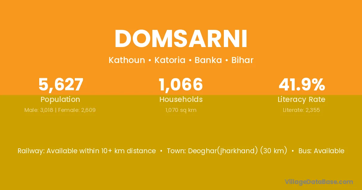 Deoghar(jharkhand) (30 km) is the nearest town to Domsarni village for major economic activities and is located approximately 30 km away.