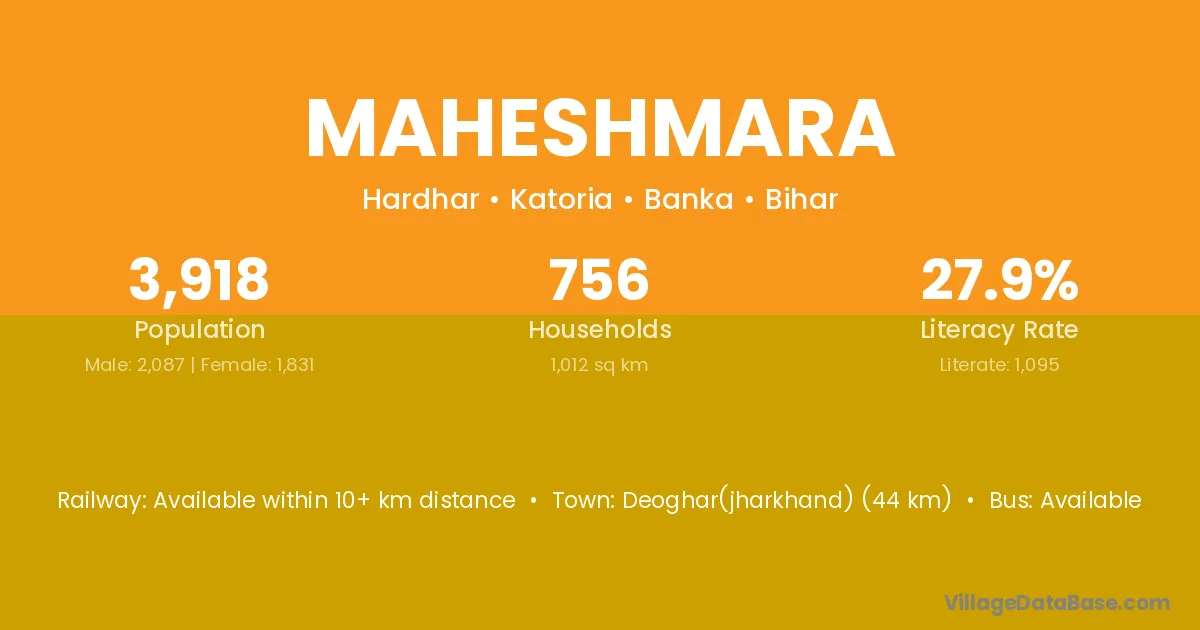 Deoghar(jharkhand) (44 km) is the nearest town to Maheshmara village for major economic activities and is located approximately 44 km away.