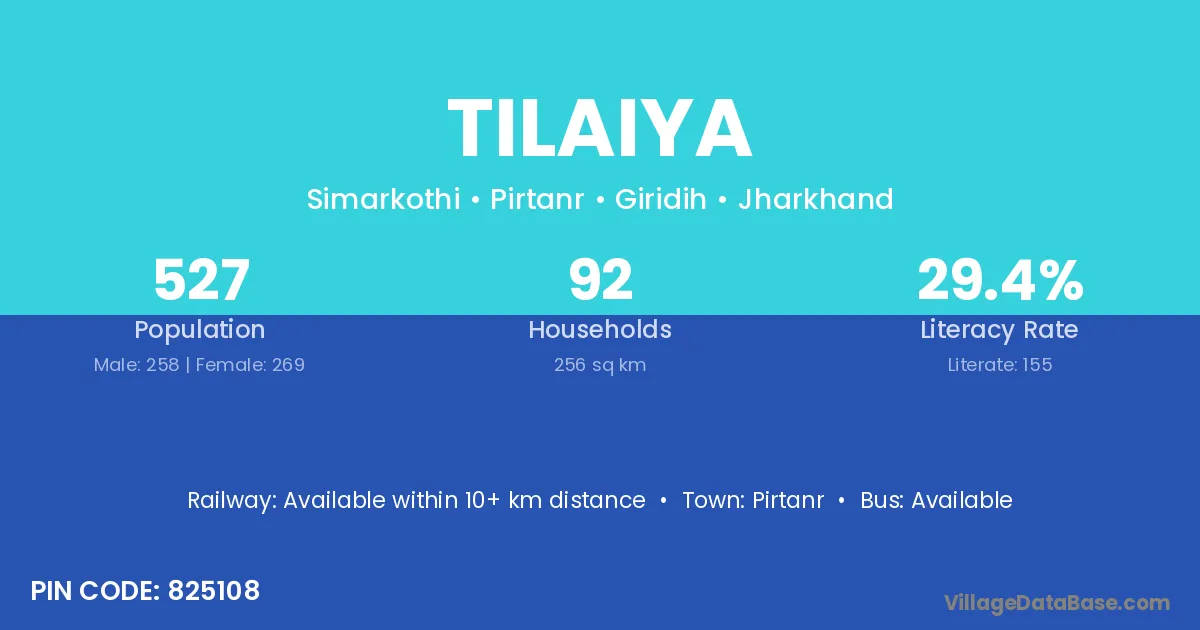 Banka (40 km) is the nearest town to Tilaiya village for major economic activities and is located approximately 40 km away.