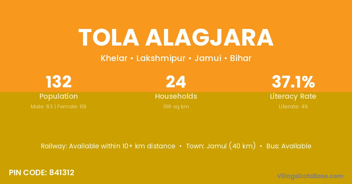 Deoghar(jharkhand) (29 km) is the nearest town to Tola Alagjara village for major economic activities and is located approximately 29 km away.
