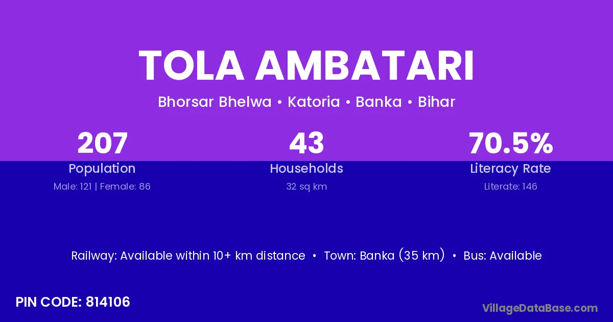 Banka (35 km) is the nearest town to Tola Ambatari village for major economic activities and is located approximately 35 km away.