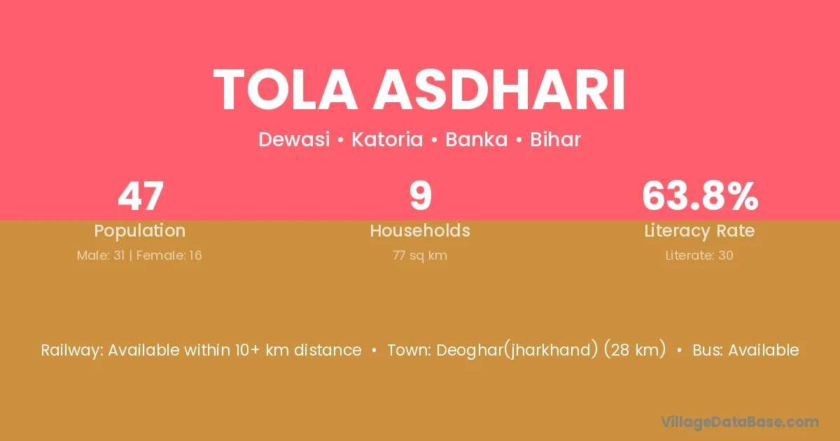 Deoghar(jharkhand) (28 km) is the nearest town to Tola Asdhari village for major economic activities and is located approximately 28 km away.