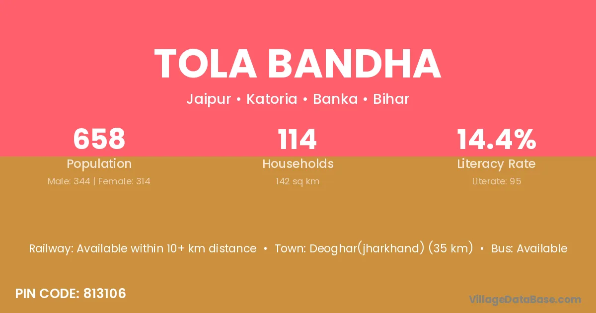 Deoghar(jharkhand) (35 km) is the nearest town to Tola Bandha village for major economic activities and is located approximately 35 km away.