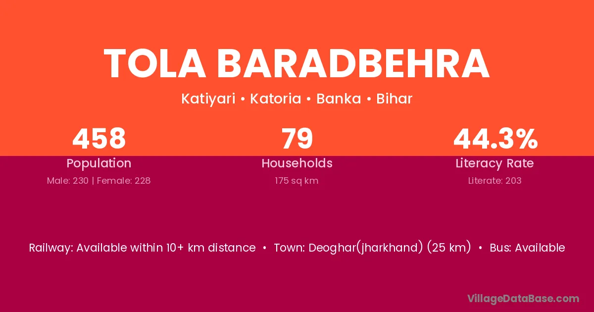 Deoghar(jharkhand) (25 km) is the nearest town to Tola Baradbehra village for major economic activities and is located approximately 25 km away.