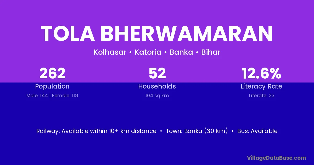 Banka (30 km) is the nearest town to Tola Bherwamaran village for major economic activities and is located approximately 30 km away.