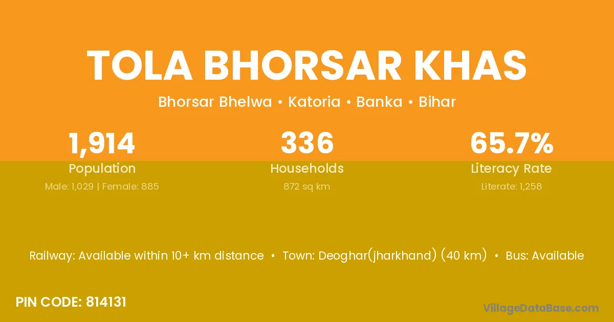 Deoghar(jharkhand) (40 km) is the nearest town to Tola Bhorsar Khas village for major economic activities and is located approximately 40 km away.