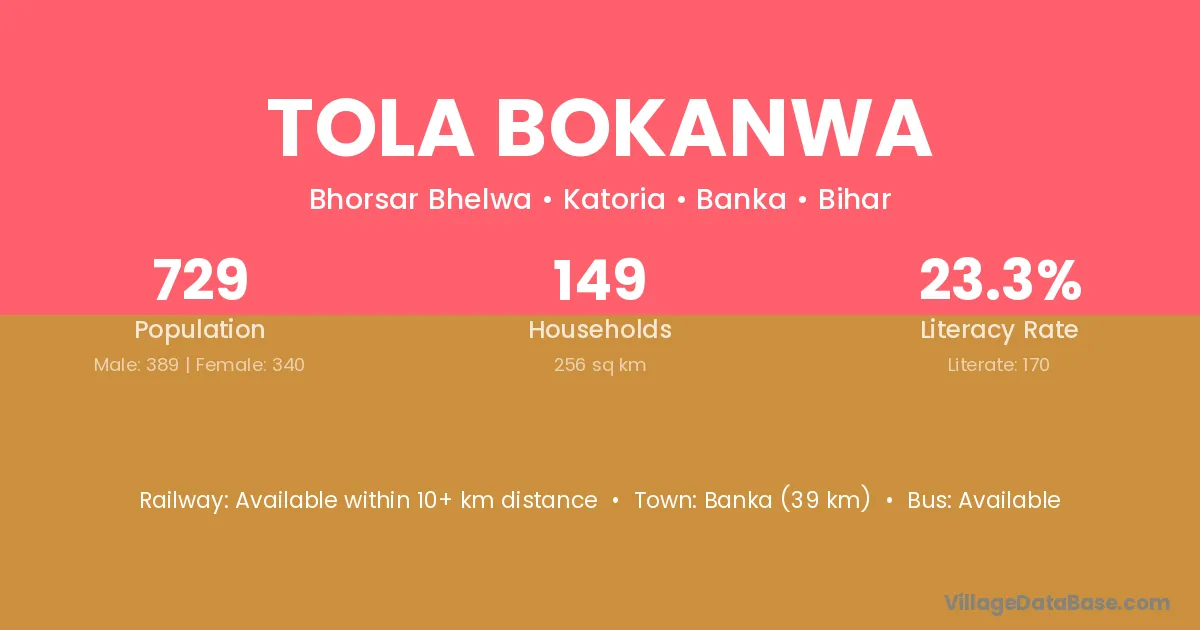 Banka (39 km) is the nearest town to Tola Bokanwa village for major economic activities and is located approximately 39 km away.