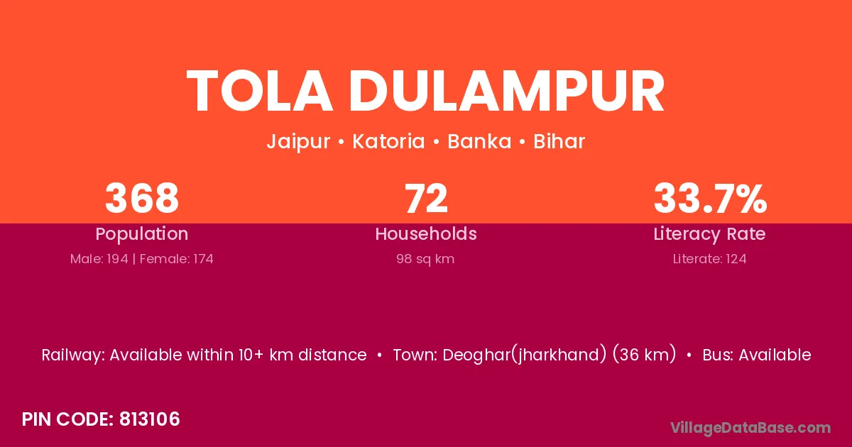 Deoghar(jharkhand) (36 km) is the nearest town to Tola Dulampur village for major economic activities and is located approximately 36 km away.