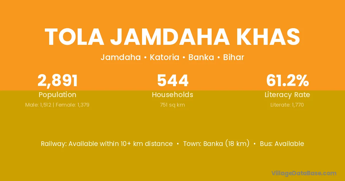 Banka (18 km) is the nearest town to Tola Jamdaha Khas village for major economic activities and is located approximately 18 km away.