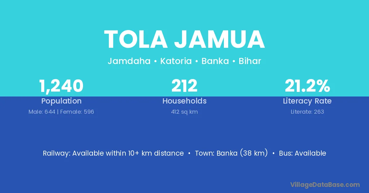 Banka (38 km) is the nearest town to Tola Jamua village for major economic activities and is located approximately 38 km away.