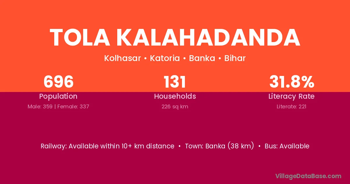 Banka (38 km) is the nearest town to Tola Kalahadanda village for major economic activities and is located approximately 38 km away.