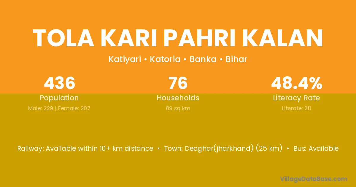 Deoghar(jharkhand) (25 km) is the nearest town to Tola Kari Pahri Kalan village for major economic activities and is located approximately 25 km away.