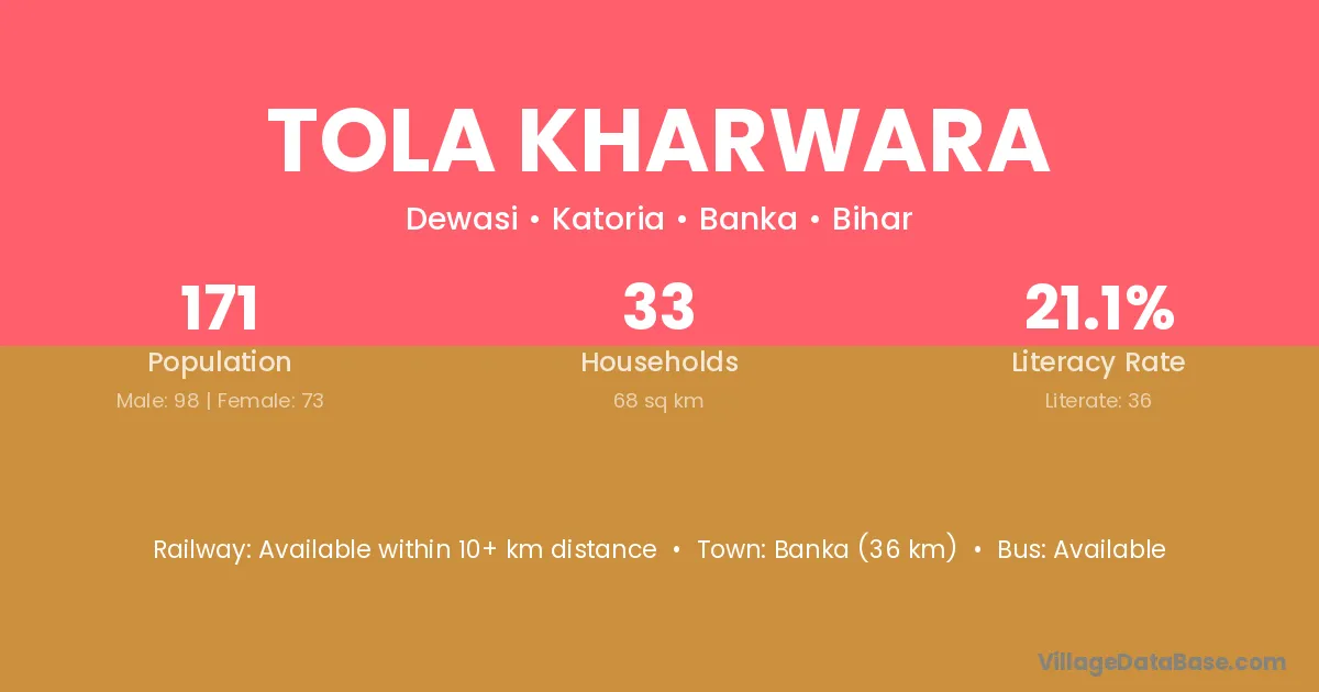 Banka (36 km) is the nearest town to Tola Kharwara village for major economic activities and is located approximately 36 km away.