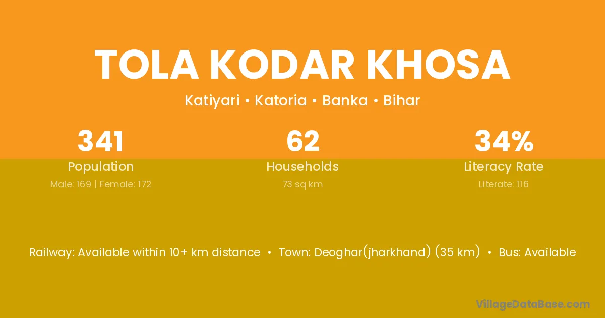 Deoghar(jharkhand) (35 km) is the nearest town to Tola Kodar Khosa village for major economic activities and is located approximately 35 km away.