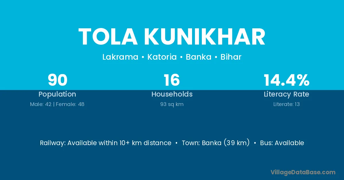 Banka (39 km) is the nearest town to Tola Kunikhar village for major economic activities and is located approximately 39 km away.
