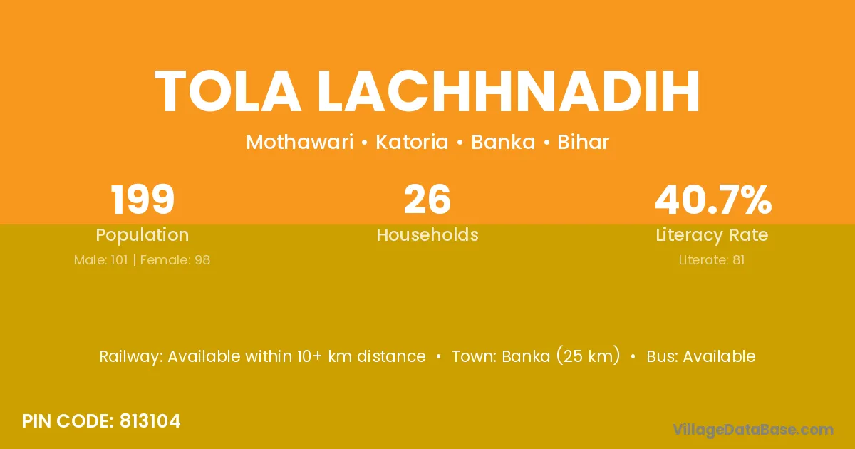 Banka (25 km) is the nearest town to Tola Lachhnadih village for major economic activities and is located approximately 25 km away.