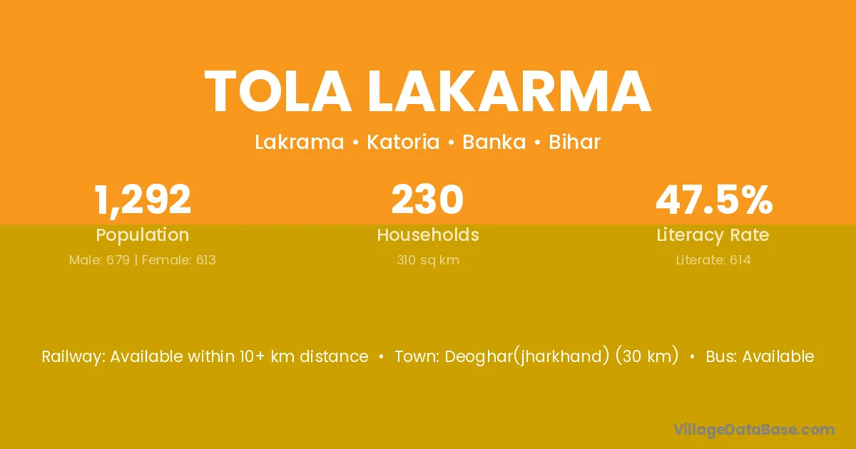 Deoghar(jharkhand) (30 km) is the nearest town to Tola Lakarma village for major economic activities and is located approximately 30 km away.