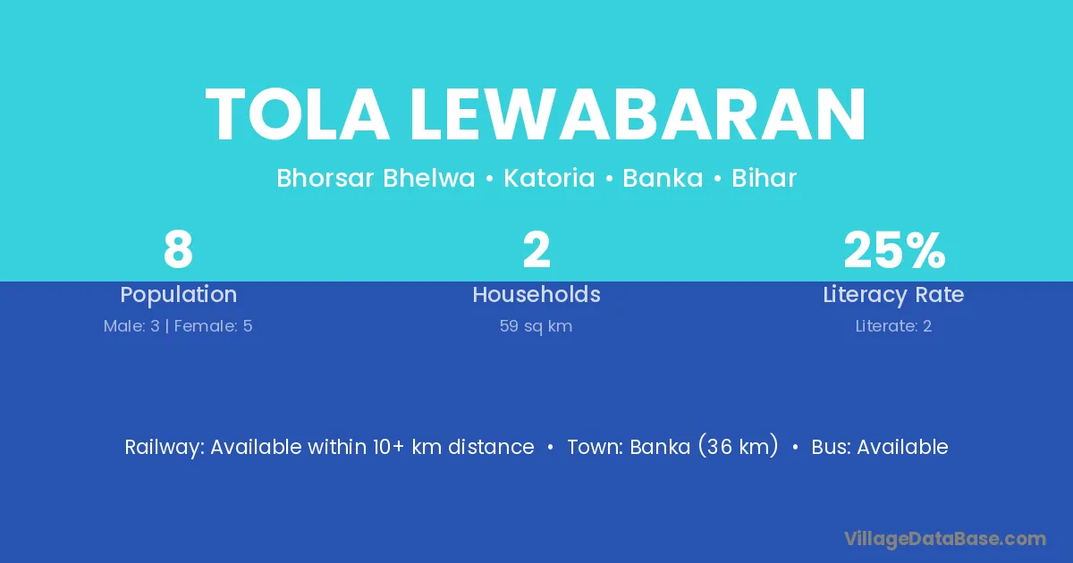 Banka (36 km) is the nearest town to Tola Lewabaran village for major economic activities and is located approximately 36 km away.