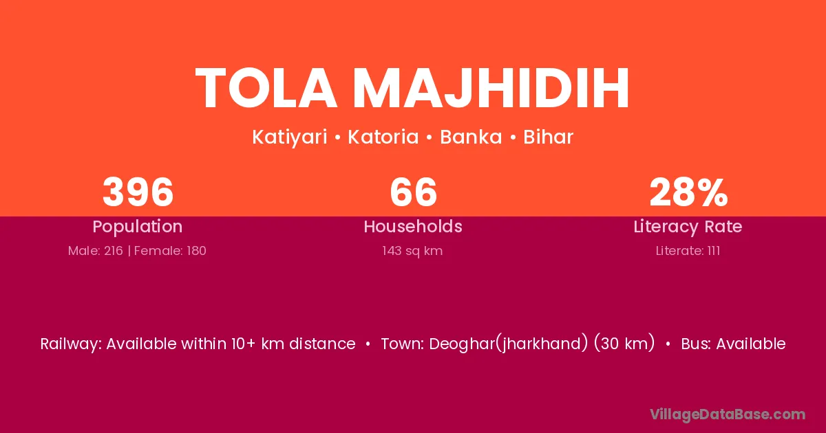 Deoghar(jharkhand) (30 km) is the nearest town to Tola Majhidih village for major economic activities and is located approximately 30 km away.