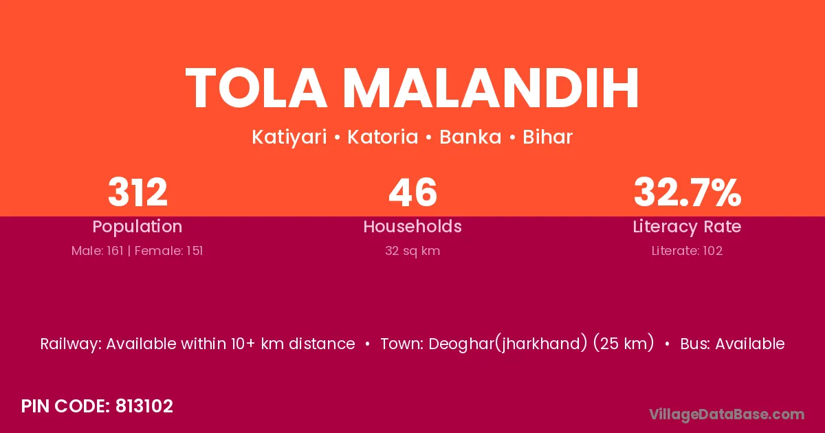 Deoghar(jharkhand) (25 km) is the nearest town to Tola Malandih village for major economic activities and is located approximately 25 km away.