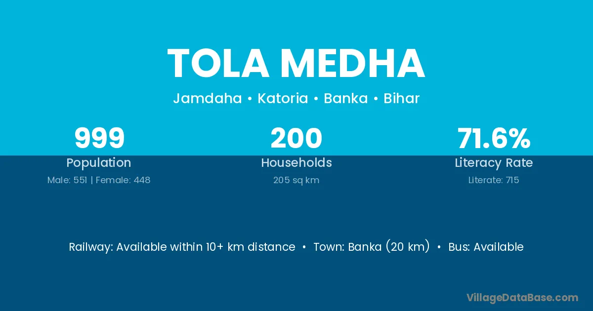 Banka (20 km) is the nearest town to Tola Medha village for major economic activities and is located approximately 20 km away.