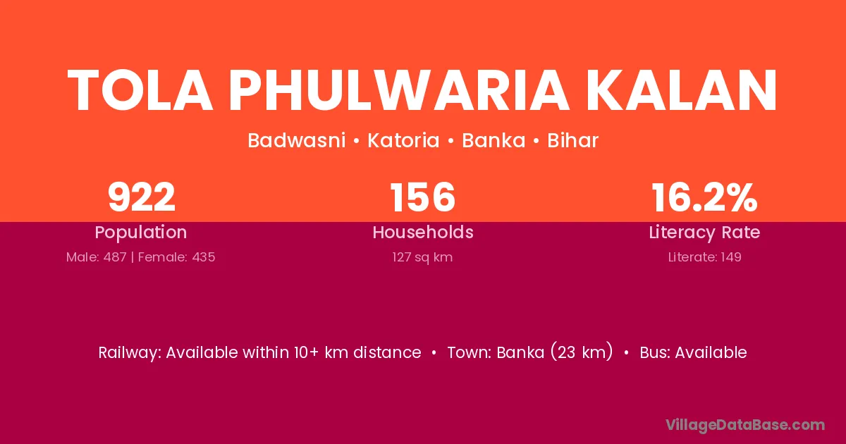Banka (23 km) is the nearest town to Tola Phulwaria Kalan village for major economic activities and is located approximately 23 km away.