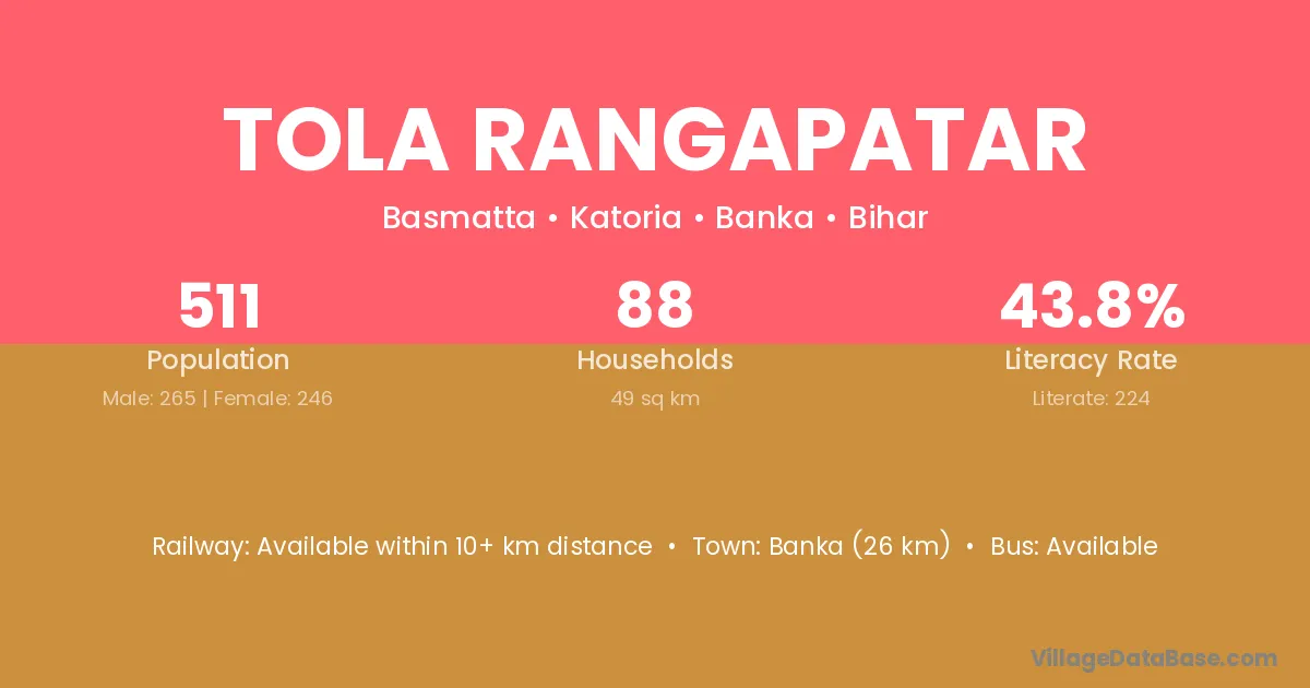 Banka (26 km) is the nearest town to Tola Rangapatar village for major economic activities and is located approximately 26 km away.
