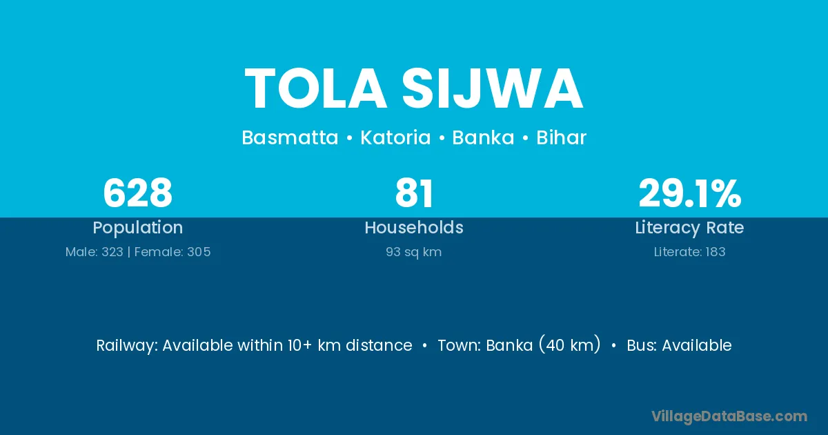 Banka (40 km) is the nearest town to Tola Sijwa village for major economic activities and is located approximately 40 km away.