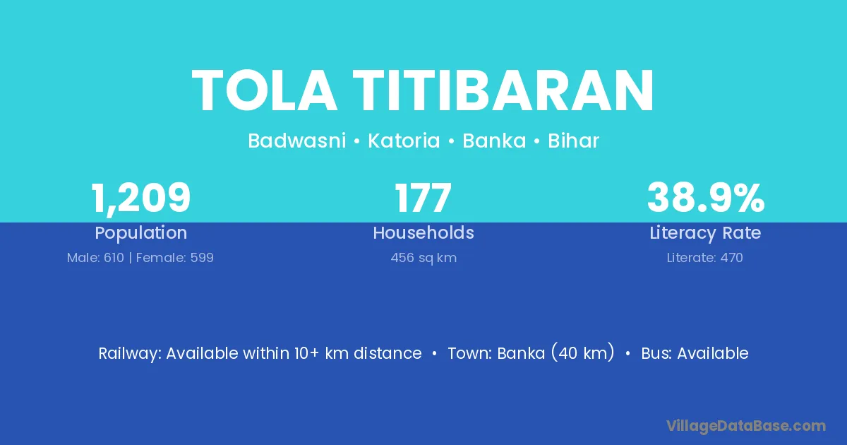 Banka (40 km) is the nearest town to Tola Titibaran village for major economic activities and is located approximately 40 km away.