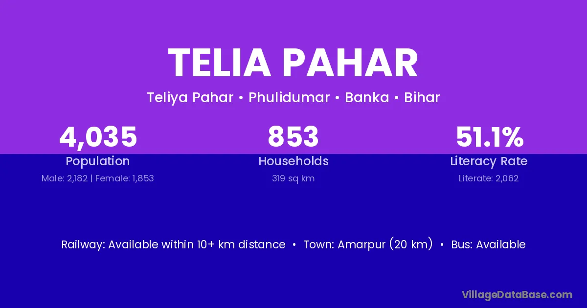 Telia Pahar village has a total population of 4,035 people, of which 2,182 are males and 1,853 are females.