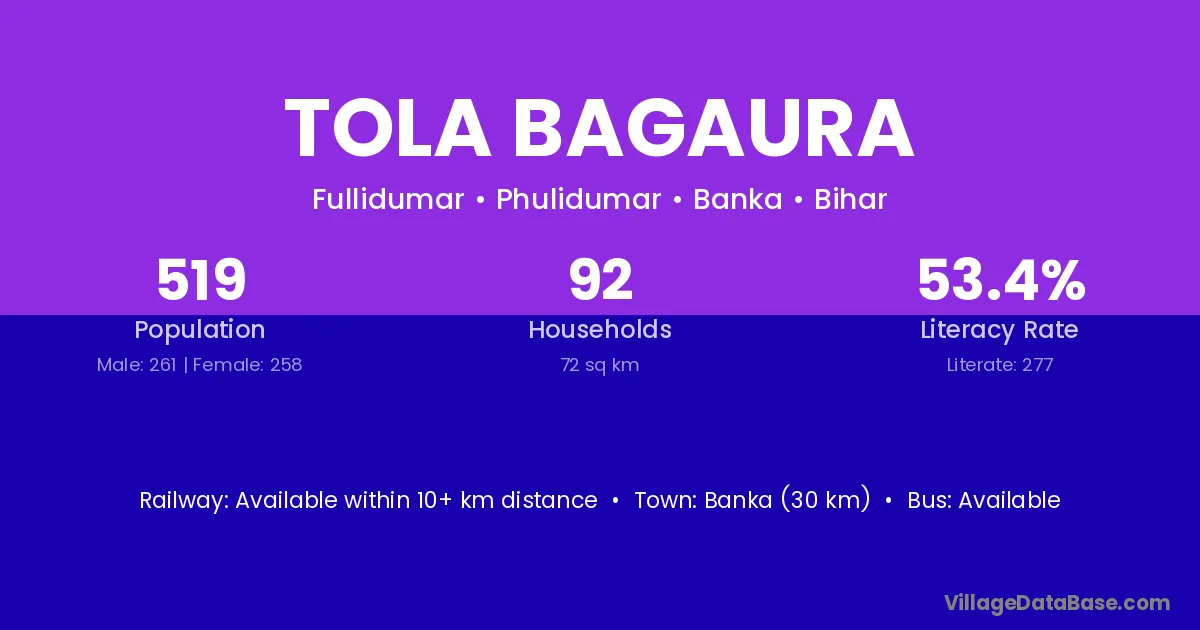 Banka (30 km) is the nearest town to Tola Bagaura village for major economic activities and is located approximately 30 km away.