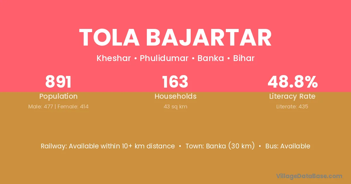 Banka (30 km) is the nearest town to Tola Bajartar village for major economic activities and is located approximately 30 km away.