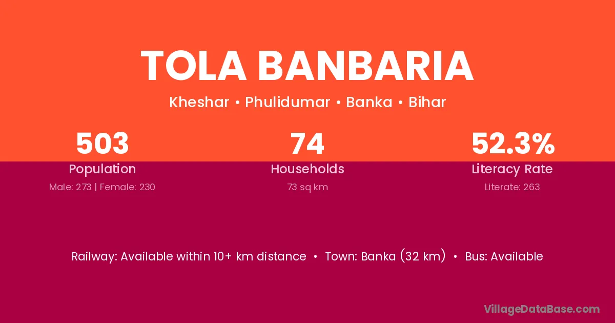 Banka (32 km) is the nearest town to Tola Banbaria village for major economic activities and is located approximately 32 km away.