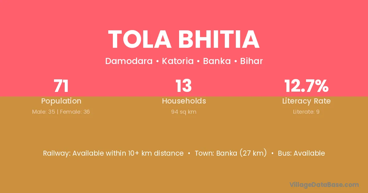 Banka (29 km) is the nearest town to Tola Bhitia village for major economic activities and is located approximately 29 km away.