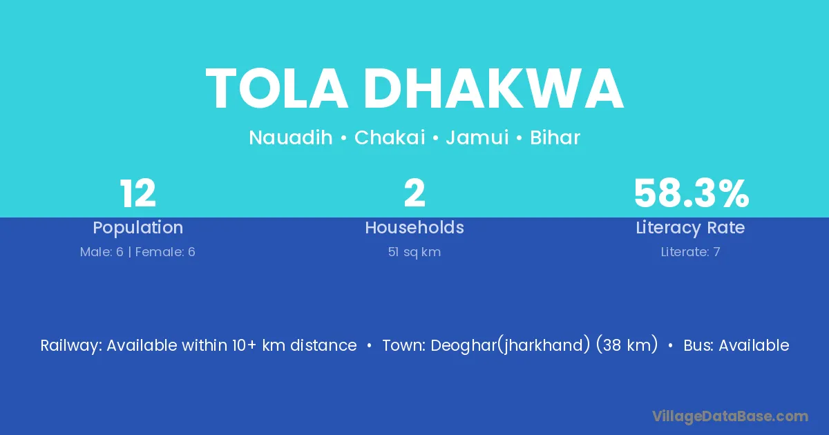 Banka (30 km) is the nearest town to Tola Dhakwa village for major economic activities and is located approximately 30 km away.