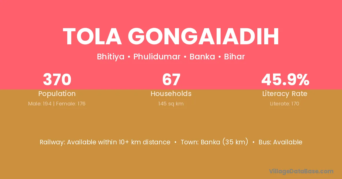 Banka (35 km) is the nearest town to Tola Gongaiadih village for major economic activities and is located approximately 35 km away.