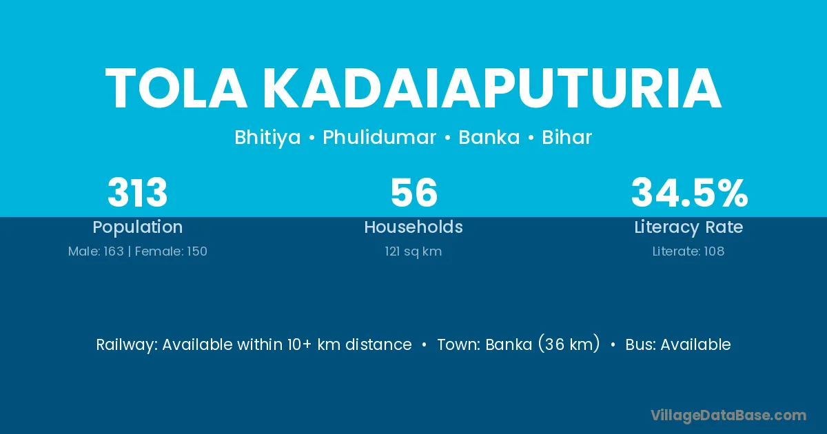 Banka (36 km) is the nearest town to Tola Kadaiaputuria village for major economic activities and is located approximately 36 km away.