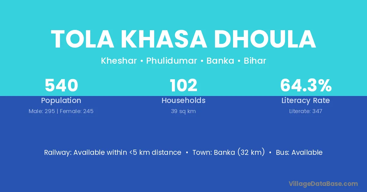 Banka (32 km) is the nearest town to Tola Khasa Dhoula village for major economic activities and is located approximately 32 km away.