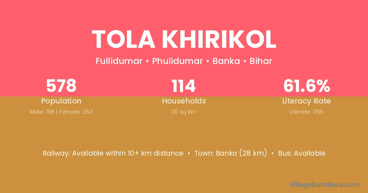 Banka (28 km) is the nearest town to Tola Khirikol village for major economic activities and is located approximately 28 km away.