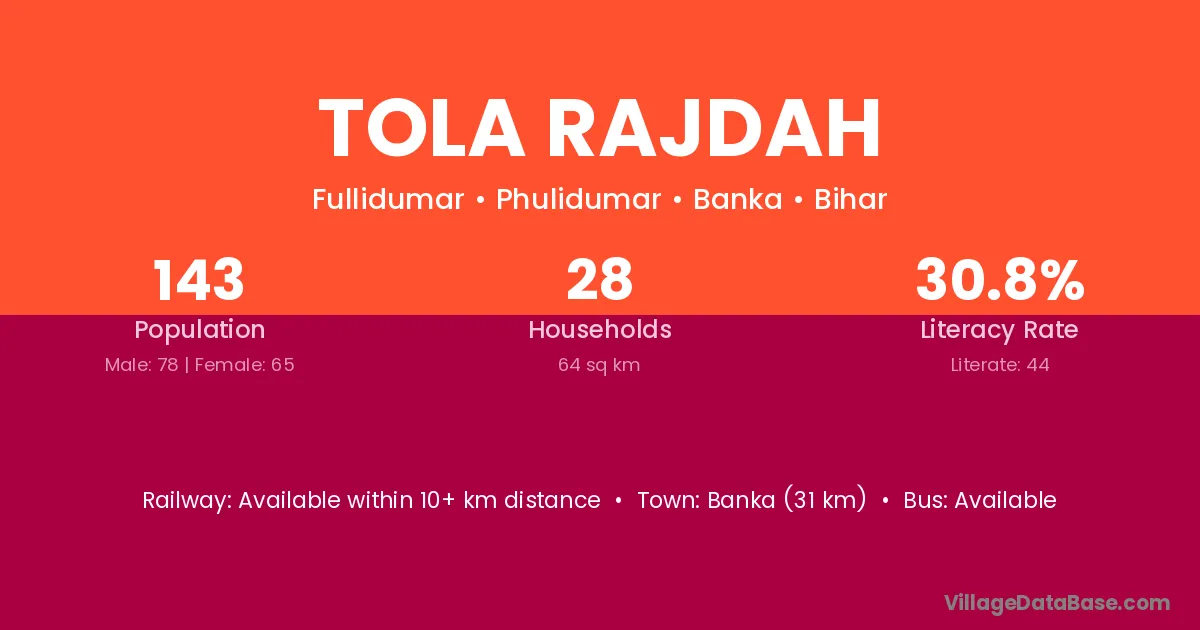 Banka (31 km) is the nearest town to Tola Rajdah village for major economic activities and is located approximately 31 km away.