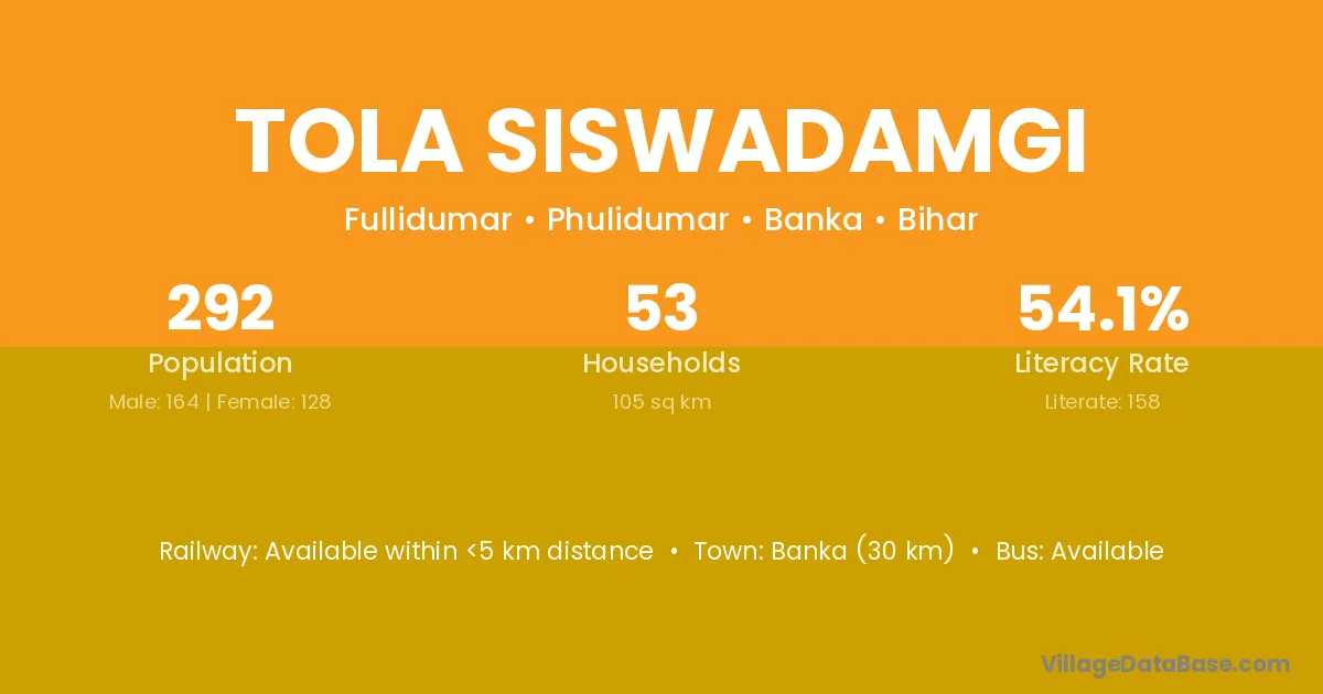 Banka (30 km) is the nearest town to Tola Siswadamgi village for major economic activities and is located approximately 30 km away.
