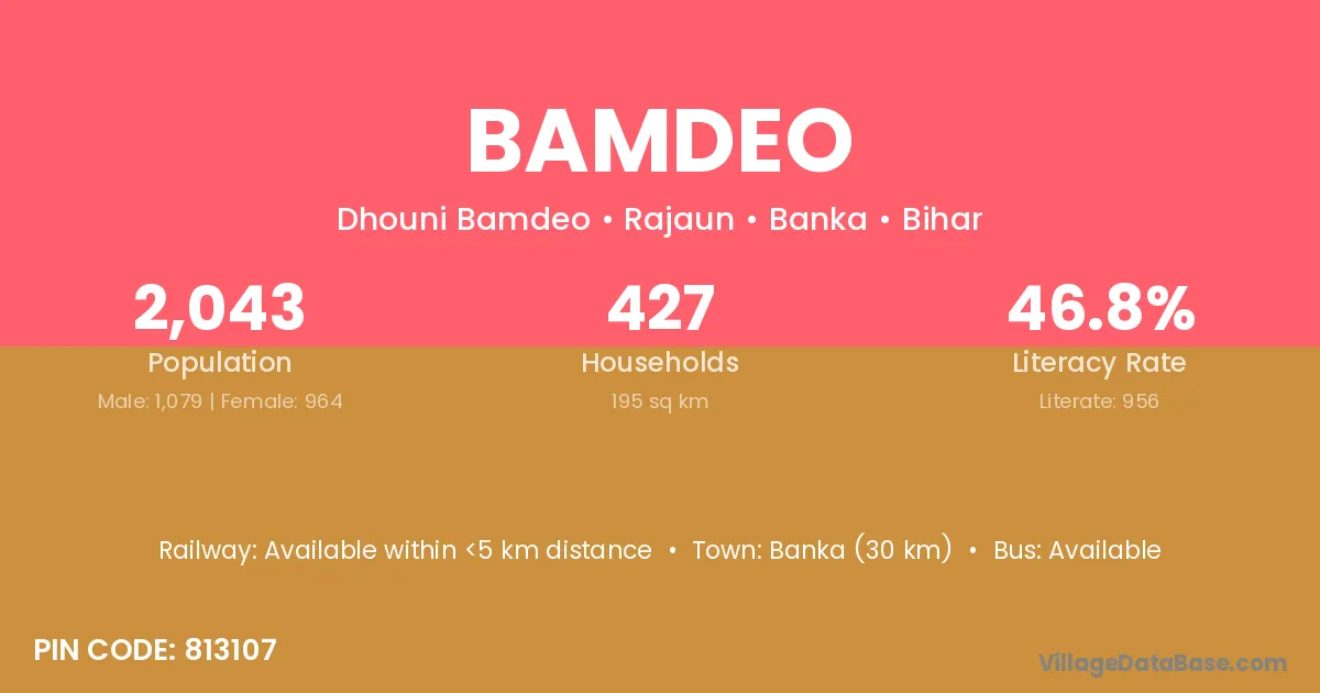 Banka (30 km) is the nearest town to Bamdeo village for major economic activities and is located approximately 30 km away.