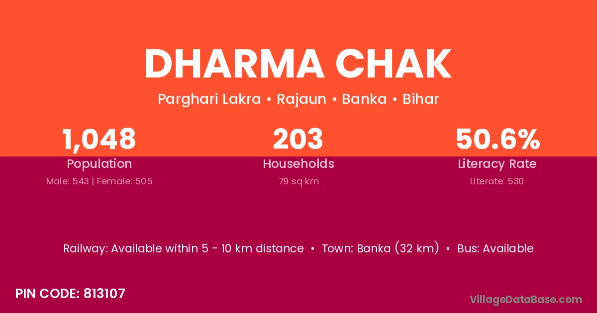 Banka (32 km) is the nearest town to Dharma Chak village for major economic activities and is located approximately 32 km away.