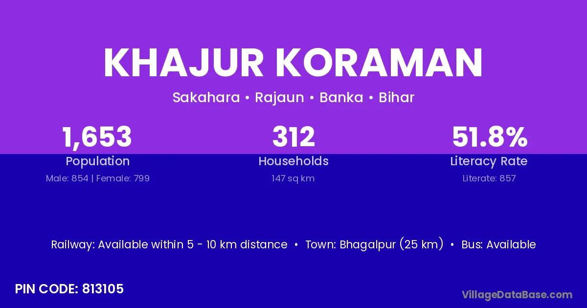 Bhagalpur (25 km) is the nearest town to Khajur Koraman village for major economic activities and is located approximately 25 km away.