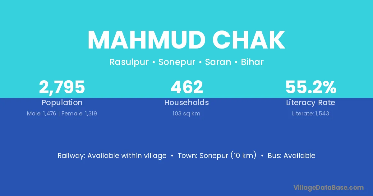 Bhagalpur (19 km) is the nearest town to Mahmud Chak village for major economic activities and is located approximately 19 km away.