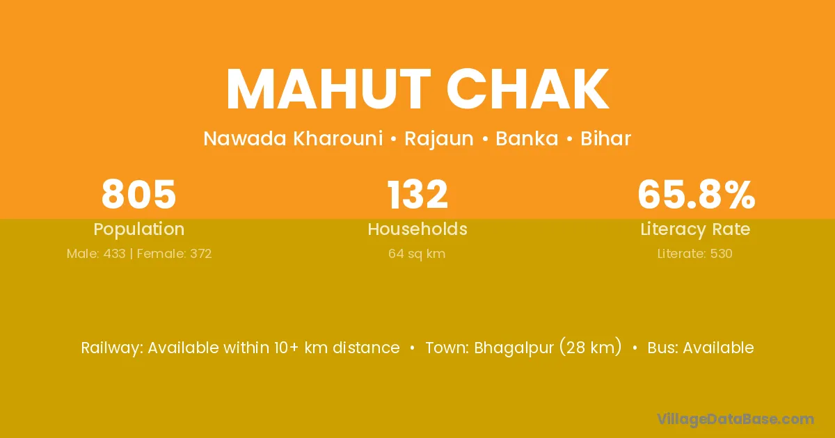 Bhagalpur (28 km) is the nearest town to Mahut Chak village for major economic activities and is located approximately 28 km away.