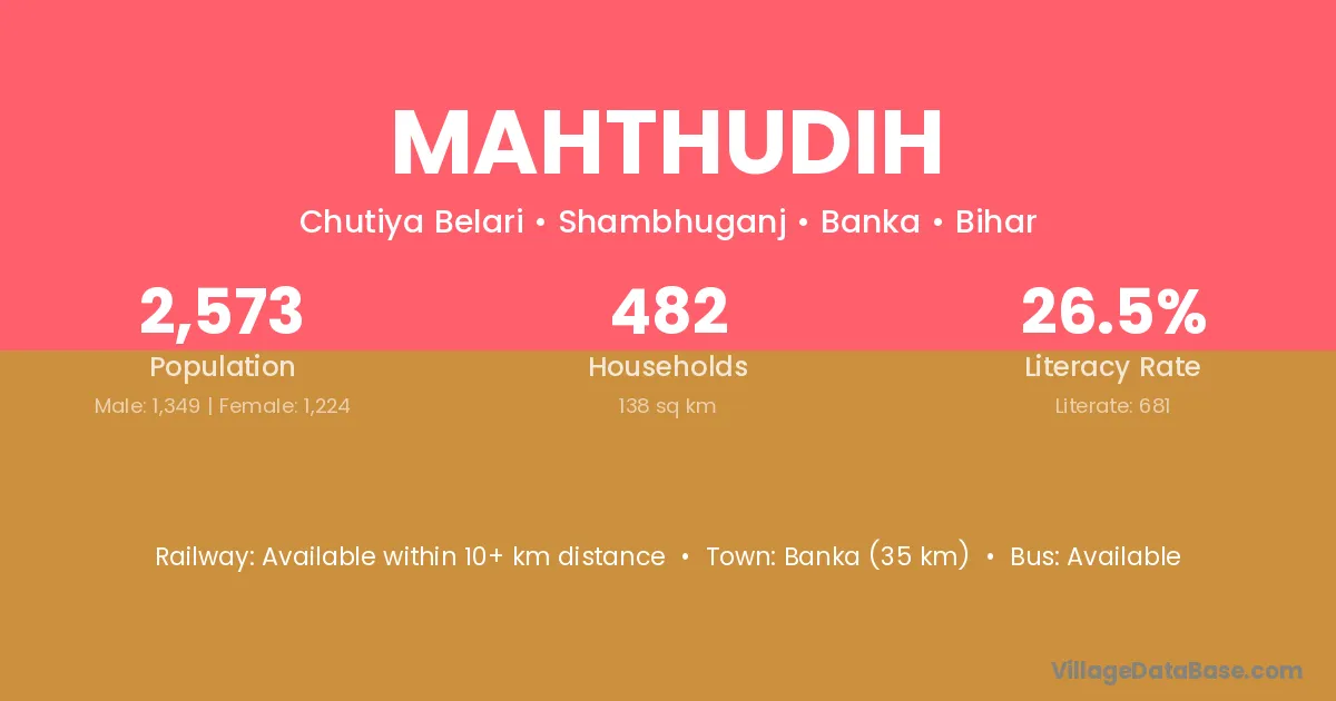 Banka (35 km) is the nearest town to Mahthudih village for major economic activities and is located approximately 35 km away.